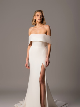 Audrey is an off the shoulder fitted gown with a paneled bodice and a side slit.