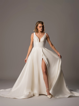 Maeve is an aline gown with a plunge neckline, wide waistband, pleated skirt and side slit.